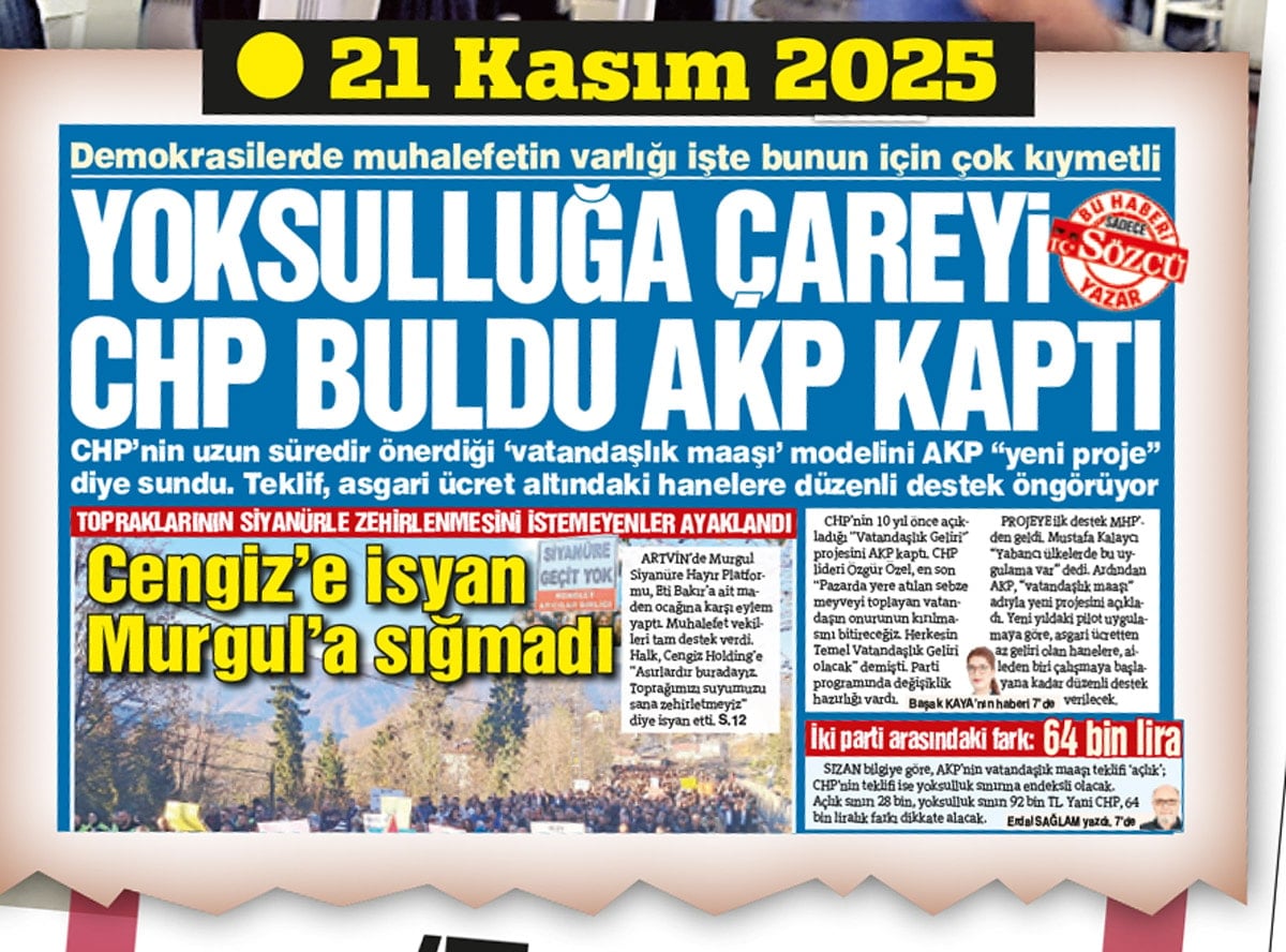 AKP iktidarının yarattığı yoksulluğu çözmek için CHP’nin çözüm olarak önerdiği sistemi AKP’nin yeni proje olarak sunduğunu 21 Kasım’da gazetemizin manşetine taşıdık. Başak Kaya’nın haberinde CHP’nin 10 yıl önce açıkladığı projeyle ilgili Özgür Özel’in “Herkesin Temel Vatandaşlık Geliri olacak” ifadesi de yer almıştı. Benzer bir projeyi CHP’nin ardından MHP de açıkladı.