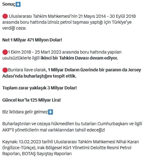 Daha önce Türkiye’nin, Irak Merkezi Hükümeti’nin izni olmadan petrol taşıyarak Ceyhan’dan yükleme yaptığı iddiasıyla Uluslararası Tahkim Mahkemesi tarafından cezalandırıldığını söyleyen ve “Cumhurbaşkanı Erdoğan’ın Yüce Divan’da yargılanmasına neden olacak belgeleri paylaşıyorum!” diyen CHP Genel Başkan Yardımcısı ve Zonguldak Milletvekili Deniz Yavuzyılmaz, yeni bir iddiada bulundu. “Petrol akışının yeniden başlaması, AKP’nin son 10 yılda bu boru hattındaki karanlık petrol ticaretinin faturasını ortadan kaldırmıyor. AKP’nin karanlık petrol ticaretinin Türkiye’ye faturası 3 milyar dolar!” diyen Yavuzyılmaz, iddiasına kaynak olarak Uluslararası Tahkim Mahkemesi Nihai Kararı, Irak Bölgesel Kürt Yönetimi Deloitte Resmi Petrol Raporları ile BOTAŞ Sayıştay Raporları’nı gösterdi.