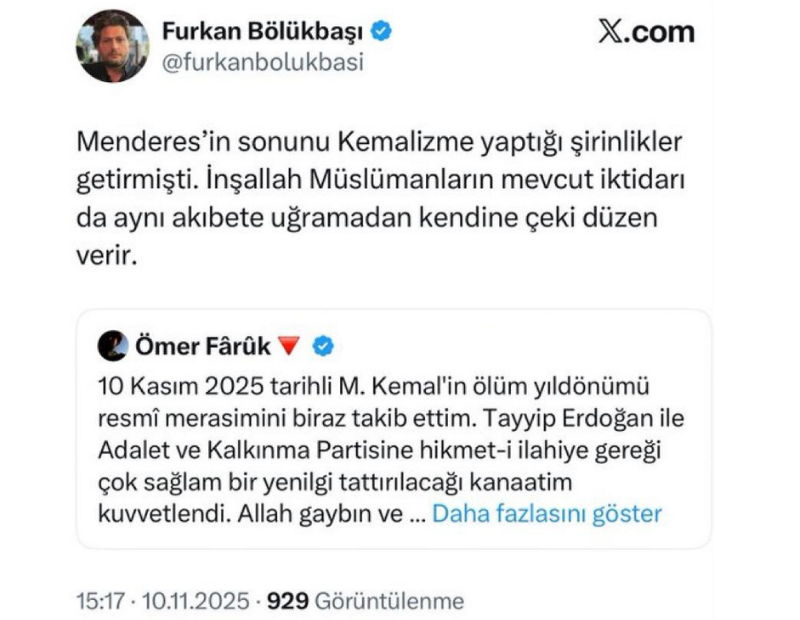 ‘Ömer Faruk’ rumuzlu bir kullanıcının “10 Kasım 2025 tarihli M.Kemal’in ölüm yıldönümü resmi merasimini biraz takip ettim. Tayyip Erdoğan ile Adalet ve Kalkınma Partisine hikmet-i ilahiye gereği çok sağlam bir yenilgi tattırılacağı kanaatim kuvvetlendi…” paylaşımını alıntılayan Bölükbaşı, şu ifadeleri kullandı: