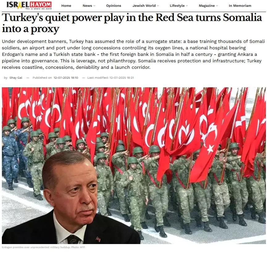 Savaş suçlusu Başbakan Netanyahu’nun hükümetine yakınlığıyla bilinen Israel Hayom gazetesinde yayınlanan bir analizde, Türkiye’nin Kızıldeniz’deki sessiz güç oyunlarıyla Somali’yi bir “vekil devlete” dönüştürdüğü öne sürüldü. Analist Shay Gal imzalı yazıda, Ankara’nın bu hamlesinin bölgedeki tüm stratejik dengeleri altüst etme potansiyeli taşıdığı vurgulandı.